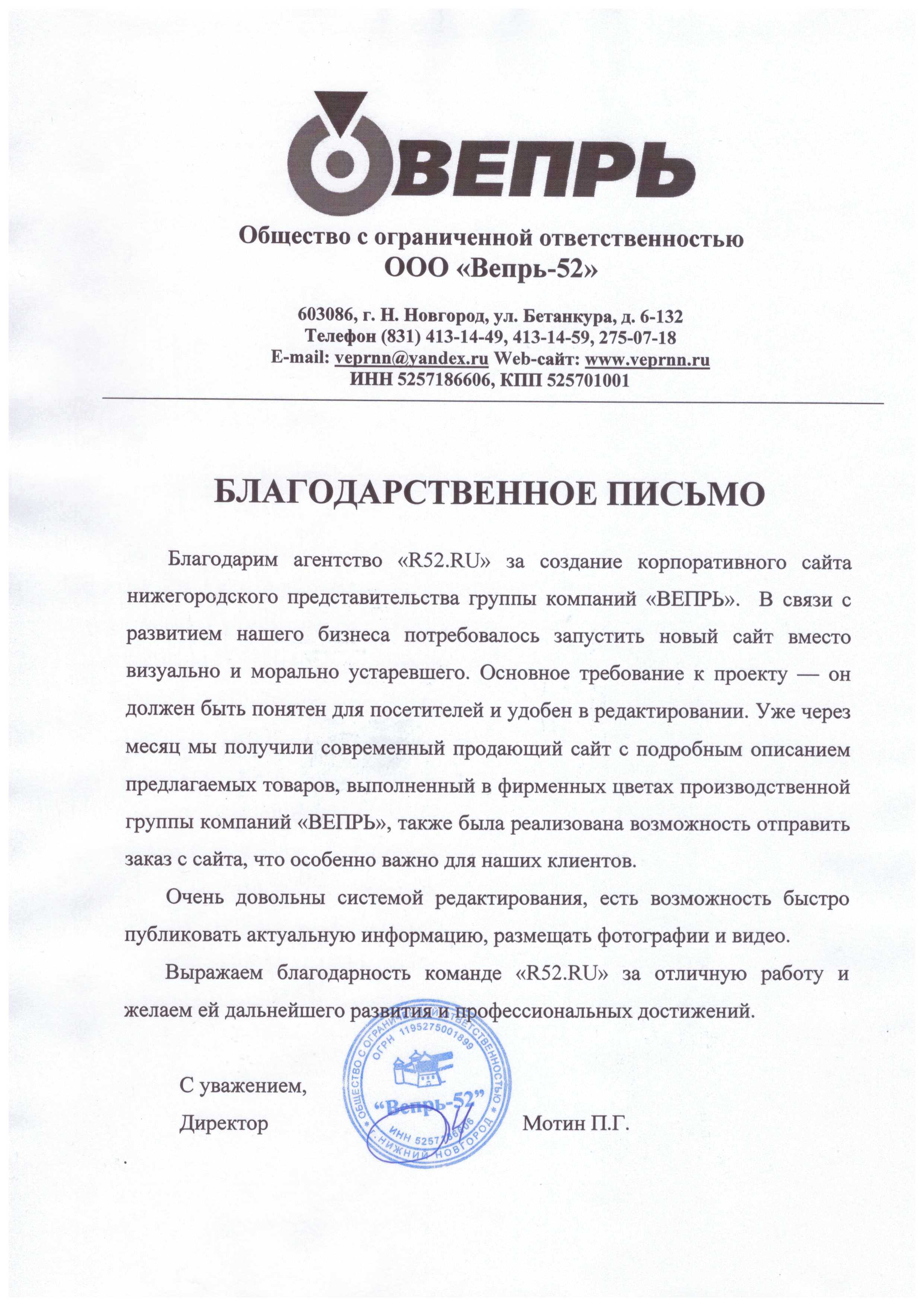 Благодарим агентство «R52.RU» за создание корпоративного сайта группы компаний «ВЕПРЬ». В связи с развитием нашего бизнеса потребовалось запустить новый сайт вместо визуально и морально устаревшего. Основное требование к проекту — он должен быть понятен для посетителей и удобен в редактировании. Уже через месяц мы получили современный продающий сайт с подробным описанием предлагаемых товаров, выполненный в фирменных цветах производственной группы компаний «ВЕПРЬ», также была реализована возможность отправить заказ с сайта, что особенно важно для наших клиентов.