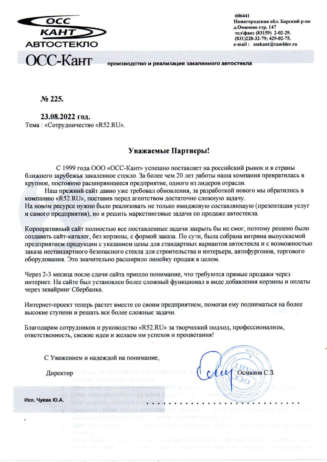 С 1999 года ООО «ОСС-Кант» успешно поставляет на российский рынок и в страны ближнего зарубежья закаленное стекло. За более чем 20 лет работы наша компания превратилась в крупное, постоянно расширяющееся предприятие, одного из лидеров отрасли. Наш старый сайт давно уже требовал обновления, за разработкой нового мы обратились в компанию «R52.RU», поставив перед агентством достаточно сложную задачу.